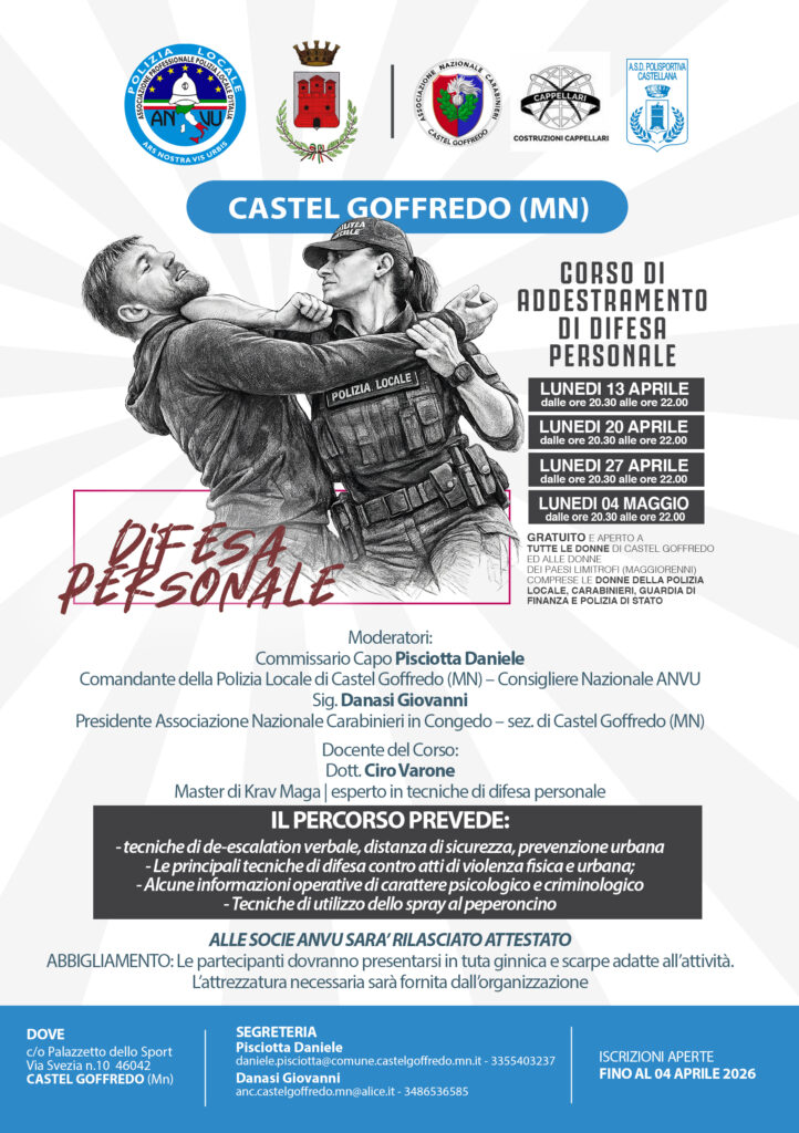 L’Associazione Professionale ANVU – Polizia Locale d’Italia, in collaborazione con il Comune di Castel Goffredo e con la Sezione locale dell’Associazione Nazionale Carabinieri in Congedo, promuove un corso di addestramento di difesa personale rivolto alle donne del territorio e alle appartenenti alle forze di polizia.